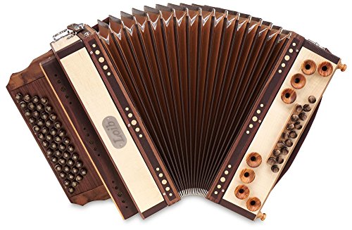 Stimmung: B-Es-As-Des, 46 Diskantknöpfe, 9 Bässe, 7 Harmonien Halbtöne, H-Bass und X-Bass entkoppelt, Ahorn massiv, Oberflächen geölt Gehäuseecken und Balgreif: Leder, Basstrichter: Holz, Balg: hellbraun innen, dunkelbraun außen, Ecken: Nickel Knöpfe: braun, ähnlich Horn, Holzverdeck, Tipo a mano Stimmzungen Gewicht: ca. 7,3 kg, Maße: ca. 38 x 20 cm, inkl. Trageriemen und Koffer